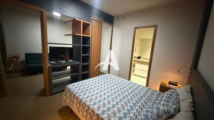 Flat localizado no bairro Saraiva, possui 01 quarto com cama, armário e mesas de cabeceira, banheiro social com armário, box e secador de cabelo, sala com ar-condicionado, painel, televisão, sofá e 02 cadeiras, cozinha com armário, frigobar e microondas